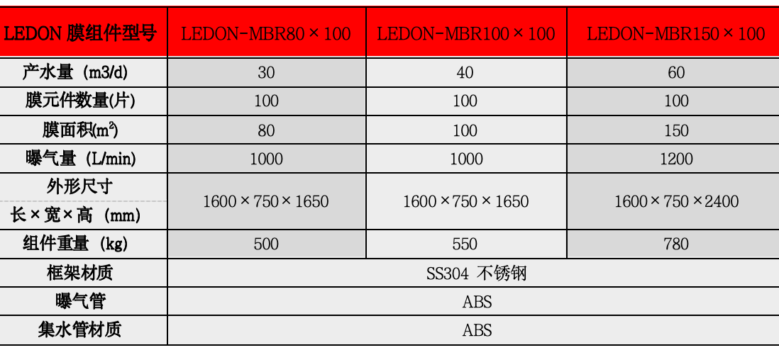 | 平板膜元件型號 | LEDON-MBR80型 | LEDON-MBR100型 | LEDON-MBR150型 |